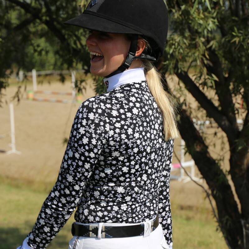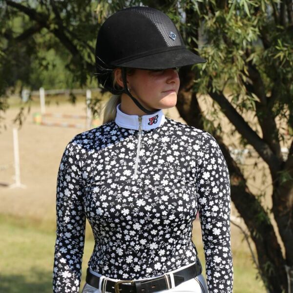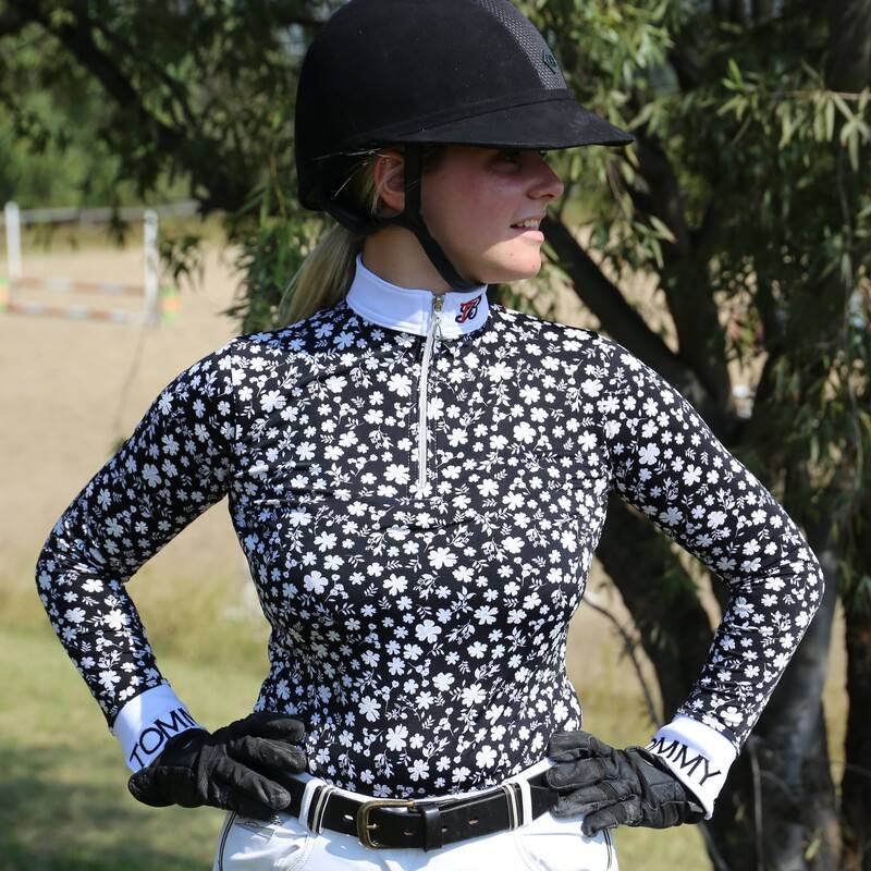 LIMITED EDITION. Smart, elegant, and simply beautiful, introducing the floral show shirt. The floral show shirt has a gorgeous black and white pattern and is perfectly paired with a white collar and cuff, both with a simple Tommy B detail. The perfect eye-catching and elegant show shirt to add to your show collection. Each Tommy B baselayer is handmade in South Africa from a soft, light and breathable 100% polyester spandex material ensuring riders are comfortable and smart all year round.